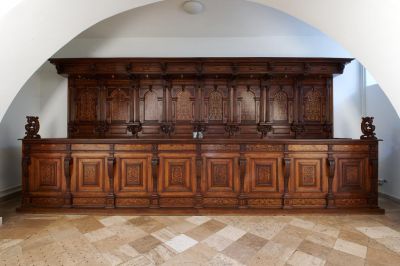 A 14. század elején kialakult bútortípus – a templomok szentélyének oldalainál, leggyakrabban a déli, hosszanti oldalfal mentén elhelyezett, (általában kettős) széksor, a stallum – rendeltetésében a késő középkor némi változást hozott. Ettől az időtől kezdve immár nem csak a székesegyházak és az apátsági templomok "kórusában" (szentélyében), hanem a városi plébániatemplomok belső terében – többnyire a főhajóban – is megjelenik ez a nagy méretű bútorzat, amely ez esetben a város elöljáróinak tartózkodási helyéül szolgál a szertartások idején. Ezt a változást példázza az itt bemutatott darab, a magyarországi késő reneszánsz bútorművészet e kiemelkedő alkotása is, amely a körmöcbányai magisztrátus tagjai számára készült, évszámának tanúsága szerint 1620-ban. Mellvédjének nyolc profilált léckeretű betétmezőjét rozettás konzolokon nyugvó pilaszterek tagolják. Talppárkányán és azzal egyező díszű könyöklője alatti frízén váltakozó, világos alapon sötét és sötét alapon világos délnémet hatású manierista indamustra fut végig. A térdeplőn legfelül fogsoros párkány zárja egységbe a tagolt elemeket. A késő gótikus reminiszcenciákat őrző kartámlák fölött konzolként funkcionáló pompásan faragott maszkok viselik a dupla, korinthoszi fejezetű, kannelúrázott féloszlopok súlyát, amelyek a stallum hátfalát osztják nyolc egyenlő részre. A kiugró mennyezetpárkány közepén az 1620-as évszámot gazdag ornamentális faragás fogja közre.