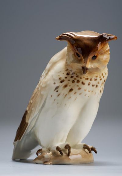 Alacsony talapzaton, zsákmányán taposó, természethűen mintázott és festett fülesbagoly.