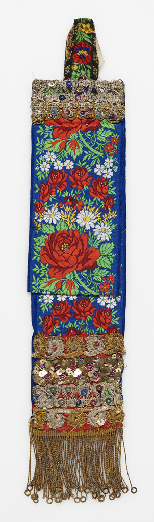Technika: | fémfonalas, rojtozott paszományszegély; jacquard szövés; szalagszövés |