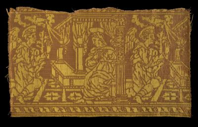 Az Angyali üdvözlet vízszintesen ismétlődő jelenetsor töredéke. Mária oszlopos, függönyös ágy előtt félig ülő, félig térdelő helyzetben fogadja a vele szemben féltérdre ereszkedő angyalt, akinek a feje fölött galamb képében megjelenik a Szentlélek. Ruth Grönwoldt (Gewebte Borten des 15–16. Jahrhunderts aus Florenz und Venedig. Heidelberg 1957. Kézirat) a firenzei figurális szövetek Angyali üdvözlet ábrázolásainak négy változatát ismerteti, ezek közül három szabad térben játszódik, a negyedik változat a kiállított szövethez hasonlóan zárt térben.