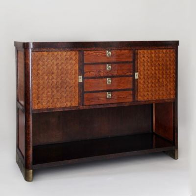 A fekvő hasáb alakú szekrény két oldallapjának meghosszabbításából képezett talapzaton áll. Alsó része nyitott polc, a felső zárt a középső négy fiókot a széleken egy-egy ajtó fogja közre. Zárópárkánya egyenes, tagolt. Szerepelt a Secession 17. kiállításán Bécsben, 1903-ban, és ugyanabban az évben Düsseldorfban is (Kunstausstellung).