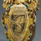 | Anyag: | aranyozott ezüst; bölényszarv; ékkövek |