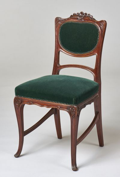 A szék elöl faragott, hátul dísztelen, ívelt négy lábon áll. Keskeny kávája faragott peremű. Enyhén trapéz alakú ülése kárpitozott. A háttámla a hátsó lábakkal egybeépített, alsó részében egy íves összekötővel megerősített. Felső részén faragott keretelésű kárpitozott háttámasz. Újabb, zöld bársonyhuzattal bevont.