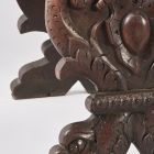Lábát helyettesítő mellső deszkalapját két delfinen nyugvó csigás-leveles keretbe komponált, felhajló peremű, drágakövet utánzó ovális motívum (cabochon) díszíti. Lesarkalt, négyzetes, belül körkörös ülőlapja alatti káváján körbefoglalt és félbevágott rozetta. Volutákból alakított, szélesedő háttámláján a mellső lappal rokon cabochon dísz.