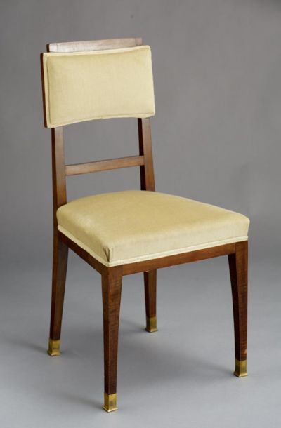 Elöl egyenes, hátul kihajló, hasábos bronzpapucsba bújtatott lábakon áll, ülőlapja kárpitozott, trapéz alakú. Egyenes zárású áttört háttámlájának kárpitozása az ülőlapéhoz hasonló.