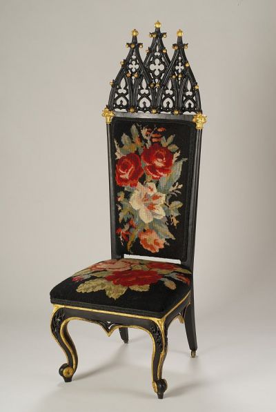 A szék alapformája neobarokk, amelyet a korszak romantikus építészetének hatására díszítettek oszloppal és gótikus rácsozattal.