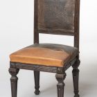 Lefelé keskenyedő, hasábos lábakon áll. Az ülés kávája faragott szalagfonatos díszítésű. A háttámla négyzetes, körbefutó vájuzatos faragással, sarkaiban csakúgy, mint a lábak és az üléskáva csatlakozópontjaiban egy-egy négyzetes mezőben elhelyezkedő faragott rozetta. Ülése és háttámlája kárpitozott.