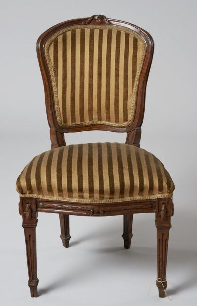 Négy felfelé vastagodó, kannelúrázott hasábos lábon áll. Ülése trapéz alakú, kávája elöl enyhén hullámos ívben hajlik. A háttámla felfelé szélesedő, oldalai ívesen hajlítottak, felső része íves záródású, középpontjában faragott füzérdísszel. Ülése és háttámlája kárpitozott.