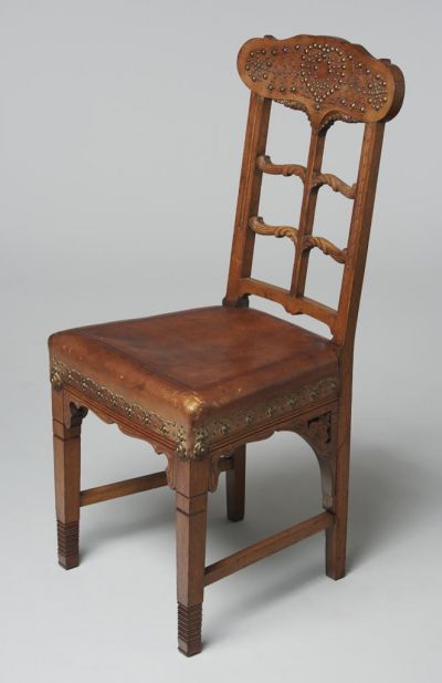 Faragó Ödön még historizáló, de már a szecesszió irányába mutató bútorainak sorába illik az a két támlásszék, melyet az Iparművészeti Társulat 1897-es karácsonyi kiállításán vásárolt az Iparművészeti Múzeum. A hasábos lábakon álló, trapéz alakú ülőlappal kialakított szék áttört támlája szimmetrikusan szerkesztett, stilizált virágot idéz. A két szélső, egyenes léc közé középre „virágszár” került, melyet hullámvonalszerű „levelek” kötnek össze a kerettel. A támla tetején rézszegekkel díszített karéjos elem alkotja a virág „fejét”, a szegecsek szív alakot, virágos-leveles indákat adnak ki. Fáját eredetileg zöldre pácolták, ami hangsúlyozta az elemek növényi eredetét. A szék szerkezetét elöl, az ülőlap alatt keskeny, faragott-áttört elem erősíti. Az ülőlap bőrrel kárpitozott, melyet nagyméretű, kerek rézszegek rögzítenek. Az első és hátsó lábak között merevítőléc kapott helyet, a lábak vége vésésekkel rovátkolt.