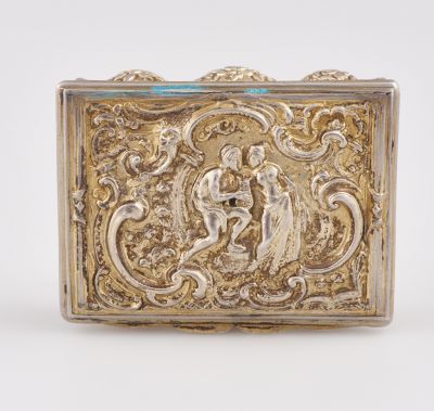 Téglány alak, oldalai hullámosak. Felnyíló fedelén rocaille-okból alakított mezőben Orpheusz és Eurüdiké alakja. A félmeztelen ifjú lanton játszik az ugyancsak félmeztelen leánynak. A kereten balra fent egy szakállas fej látható. A szelence oldalán két-két borda, a közbeeső mezőkben vésett rózsák és aszimmetrikus levelek, poncolt alapon.
