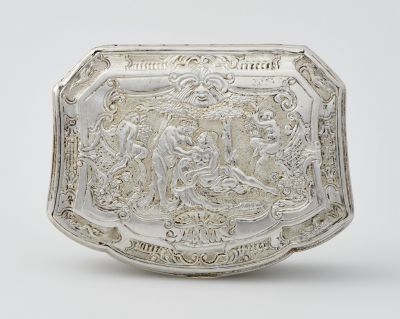 A vese alakú szelence fedelén rocaille-os keretben mitológiai jelenet: Bacchus egy fa alatt heverő nimfával enyeleg. Forgópánttal nyíló fedelének belső felén pergamenre festett finom kidolgozású miniatűr: rokokó ruhás nő portréja, kinek ruháját és rizsporos parókáját apró, rózsaszín virágok díszítik.