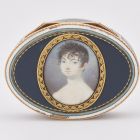 Ovális alakú, kívül szinte teljes felületén zománcozott. Fedelén ovális trébelt arany keretben, üveglap alatt, elefántcsontra festett miniatűr: empire öltözetű nő mellképe. A szelence többi részén szürkéskék zománc, szélein világoskék és fehér csíkokkal. Oldalán négy helyen függőleges díszítőmustra: fehér alapon világoskék váza alakú díszítmény.