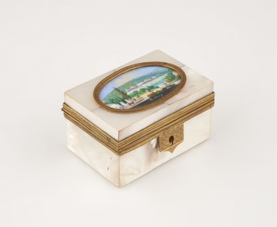 Fából készült fekvő hasáb alakú test felnyitható fedéllel. Gyöngyház lapokkal borított, vágásán aranyozott sárgaréz montírozás és homloklapján aranyozott sárgaréz kulcslyukpajzs. Fedelén aranyozott sárgaréz keretben, ovális kivágásban papírra festett gouache miniatűr látkép felirat: Weilburg. Jelezve jobbra lent: Wigand. A dobozka fedelének belső oldalán rózsaszín zsinórral keretelt üvegtükör, alsó része gyöngyházlappal bélelt. Fenekén zöld dombornyomású papírborítás.