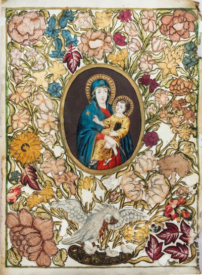 A színes virágapplikációkkal díszített keret alján felfedezhetjük a fiait tápláló pelikán alakját, amely a keresztény ikonográfiában a feltámadás és a megváltás népszerű motívuma.