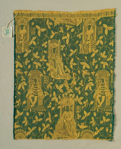 Jelzés: | felső részén beszövött felirat: „TERVEZTE BÉS SZŐTTE SZABÓ ÉVA EZÜST KOSZORUS TAKÁCSMESTER"; rárögzítve nyomtatott és tollal kitöltött védjegy: 8 / Nagy Lajos / brokát |