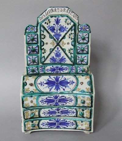 Technika: | fehér ónmázzal fedett; formába préselt elemekből összeállított; mintázott elemekkel; színes mázakkal festett |