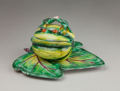 Hasonló formájú, 1755 körül a longtoni porcelángyárban készült edényt őriz a londoni Victoria and Albert Museum (lásd itt).