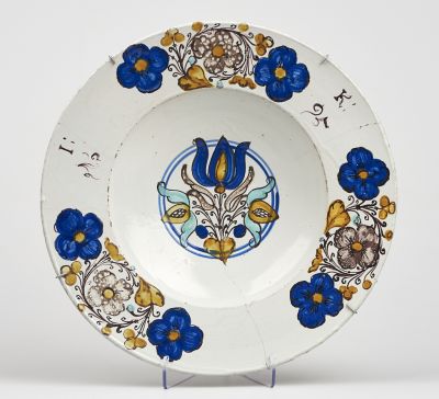 Mély öblű, enyhén emelkedő peremű tál. Öblének közepén kettős kék körben sárga szívből kinövő stilizált tulipános virágtő. Peremén három, indás, leveles, virágos díszítmény, mangánnal kontúrozott kékkel, zölddel és sárgával festett. Az egyik virágdíszítmény mellett osztott, I: K: monogram és 1695-ös évszám.