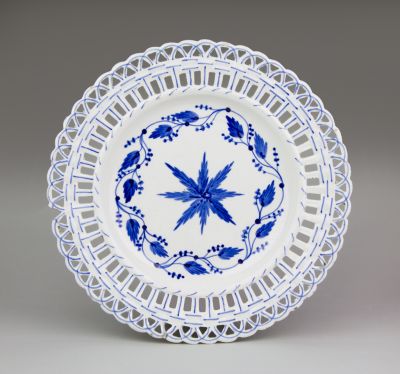 Technika: | áttört; ecsettel, szabadkézzel festett; sablonnal korongozott; színtelen máz alatt kobalttal festett |