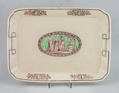Téglalap alak lemetszett sarkokkal. A keskeny, meredek perem rövidebb oldalain egy-egy domború fület utánzó díszítmény, a hosszoldalon két-két gemmát utánzó medaillon, babérágak között. Közepén babérkoszorúval övezett, ovális alakú mezőben Parisz ítéletét ábrázoló jelenet zöld és vörösbarna színnel.