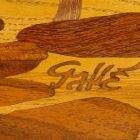 Ovális alakú, két fülénél magasodó, szélesebb peremmel. Lapján színezett, fényezetlen fából kialakított stilizált tájkép, a jobb alsó sarokban berakott Gallé jelzés.