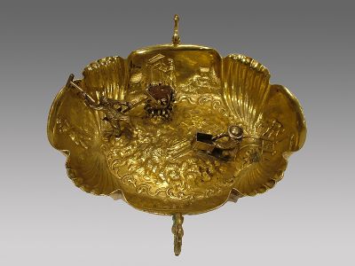 A figurák és a tál hátoldala aranyozatlan. Oldalán vésett D ötágú koronával és 4-es szám.