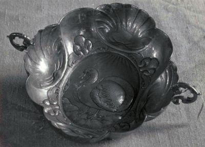 Ovális, nyolckaréjos forma. Minden második karéjt kagyló motívum tölt ki, a közbeeső karéjok alján leveles díszítmény A tál öblében kissé esetlen pulyka figura. Két oldalán áttört, leveles fül.