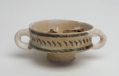 Sárgás, világos alapcserepű, ún. maiolica arcaica. Engobe-os, ón- és ólommázas, mangánbarna és zöld festéssel.
