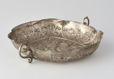 Ovális alakú. Falát négy nagyobb és négy kisebb váltakozó karéj tagolja. Peremén belül lomb- és szalagkombinációs díszítmény, az ún. „Laub- und Bandlwerk” motívum. Öblében gyümölcsköteg. Mindannyi domborított. Hosszanti oldalain két öntött, csigavonalas fül.