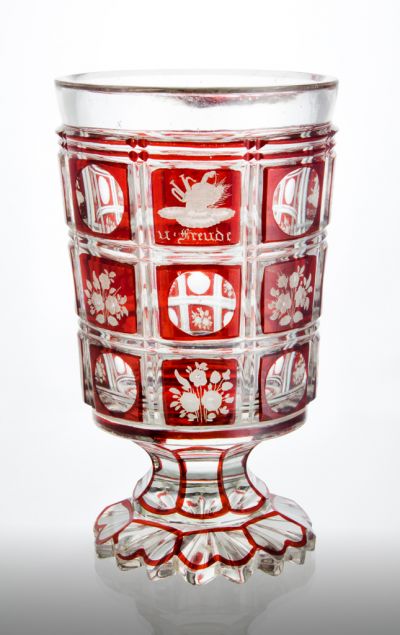Talpas díszpohár - 'Gesundheit-Glück-Freude-Vergnügen' feliratokkal, az egészség, a szerencse és az öröm jelképeivel