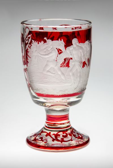A díszpohár a Friedrich Egermann (1777-1864) által kifejlesztett rézrubin-pácos cseh üveg technikájának felhasználásával készült, ám attól eltérő, egészen más felfogást képviselő ábrázolásával egyben a cseh és a magyar üvegművesség "stílusvonásainak" érdekes ötvözetét mutatja.
