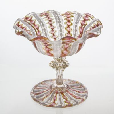 Széles, középrészén kissé emelkedő talpon, baluszter-szerű, bordázott, melegen felcsavart és fodrozott üvegfonallal és aranyfólia szemcsékkel díszített nyélen: kihajló fodrozott peremű, virágkehelyre emlékeztető test. A talpon és a testen váltakozó sávok, a vetro a retorti technikára jellemzően, csipkeszerű mintával díszítettek, opak, fehér, rózsaszín és réz-aventurin üvegfonallal. A tárgy formaadásában és díszítésében egyaránt a reneszánsz velence-muranói üveg hagyományaira épül.