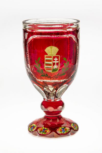 Technika: | aranyozott; formába fúvott; hámozottan csiszolt; rézrubin pácolt; színes zománcfestés |