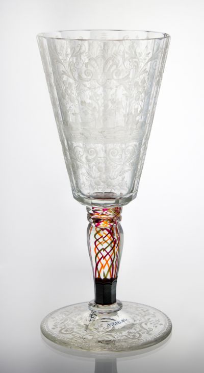 Technika: | csiszolt; ezüsttel festett (feltehetően); fazettált; fúvott; gravírozott; hámozott; színes üvegfonallal díszített |