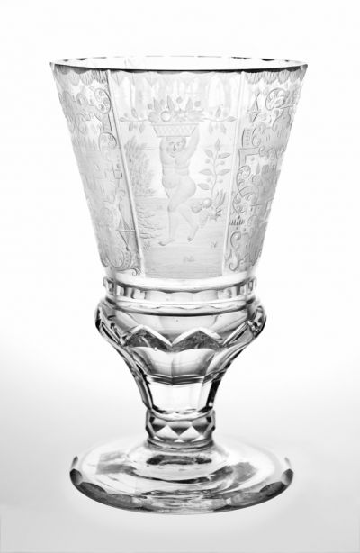 Talpa tízszögű, azon ívesen hajló szár, mely felül kiszélesedve tartja a tölcséres, felfelé szélesedő kuppát. Teste beköszörült vonalakkal hat gerezdre osztott, három mezőben almát szedő, ülő, illetve virágkosarat tartó meztelen alak, két mezőben dús keretben, táj épületekkel, illetve kastéllyal. Egy mező – valószínűleg monogram részére – üresen maradt.