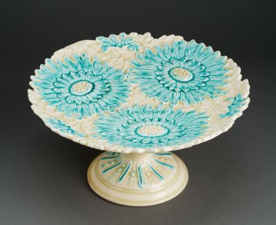Technika: | domborműves formába kézzel préselt; domborműves formára korongozott; színtelen máz alatt festett |