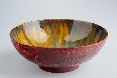 Kis talpon gömbszelet alakú tál. Öblében okkersárga, barna, zöld, kék, sugarasan folyatott máz. Kívül stilizált növényi ornamentika fluorsavval visszamaratott „ökörvér” mázzal.