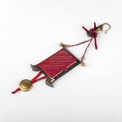 Anyag: | bordázott selyemszövet (ún. selyemripsz); fém; papír |