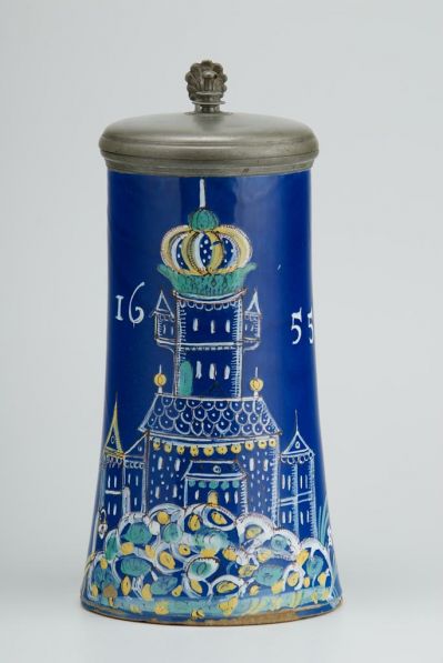 Széles talp, felfelé elkeskenyedő forma, íves fül. Szájpereme ónba foglalt, ónfedelét palmettás ujjtámasz és tagolt fogó díszíti. A kék alapú edényen emeletes, tornyos, kupolás várkastély sematikus, mangánnal kontúrozott, zölddel, sárgával, fehérrel készült rajza. A torony két oldalán 1655-ös évszám.