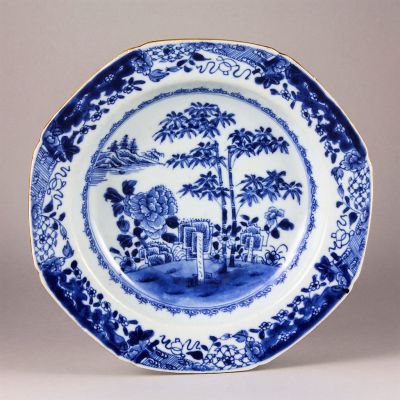 Tányér - nyolcszögletű szájperemmel, öblében kerttel, bambuszokkal