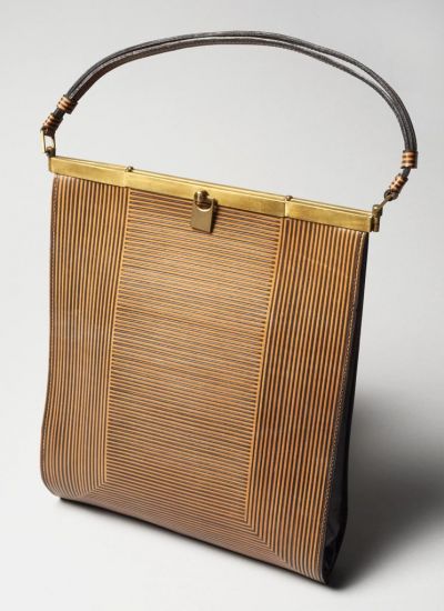Az álló téglalap alakú táska elő- és hátoldala egyforma díszítésű. Kétoldalt és alul körbefutó csíkos keretelésben a középső mező vízszintesen csíkozott. A csíkok mintegy 2 mm vastagok, a világosbarna alapszínre sötétbarnával nyomott. A táska felső részén keskeny rézpánt, mely a szélső keskeny mezőknek megfelelően és kétoldalt zsanérokkal kapcsolódik össze, így szétnyitva a táska hatszög formába megy át. A zár az előoldalon kis henger és bele fűzött téglalap alakú rézlap, hátul középen pedig a pánt alá befogva szürke kis bőrdarabon a művésznő monogramja. A táska bőségét oldalt és alul harmonika szerűen összehajtott bőr alkotja. Világosbarna selyembélés. Füle rövid, kétsoros, csíkos bőrből.