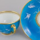 A csésze félgömb formájú, a tányér pereme ívesen, magasan felhajló. Aprólékos, de levegősen elhelyezett díszítés. A tányér közepén aranylevelekkel tűzdelt rozetta, körülötte, a csésze belső peremén ismétlődően farkasfogas minta. A masszafestés (pâte-sur-pâte) körös-körül a természetből ellesett képeket mutat. Szerény vadvirágok, kis bokor, repdeső és megpihenő madarak, lepkék gyöngéd és érzelmes jelleget adnak a könnyű, finom, elegáns tárgynak.