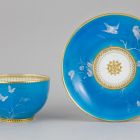 | Jelzés: | talpán masszába nyomva: MINTONS; arannyal bélyegzett gyári jelzés, három visszahajló tollat összefogó szalag, PARIS EXHIBITION 1878 - MINTONS felirattal |