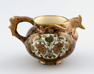 Festett díszítését perzsa előképek alapján Zsolnay Vilmos leánya, Júlia tervezte, a pécsi Janus Pannonius Múzeumban őrzött, szignált, datált tervlap (ltsz.: A 61.451.1) tanúsága szerint 1881. március 1-én (façonszám: 785., dekorzsám: 715).