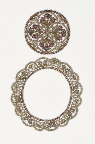 Anyag: | fémfonal; flitter; selyemfonal; vászon alap |