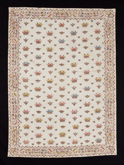 A terítő szélén végigfutó, liliomos keretelésű sávban kétfülű, virághoz hasonlító vázák mellett indákon ülő madarak és oroszlánok váltakoznak. Közepén szórtan elhelyezett nagyobb és kisebb koronák. Méretéből, valamint anyagának és hímzésének finomságából ítélve talán keresztelői takaró lehetett.