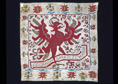 A kassai Szent Erzsébet-templom kincstárából származó terítő tükrében Szent János evangélista szimbóluma, egy kiterjesztett szárnyú sas alakja helyezkedik el, feje körül aureolával a karmai között tartott írásszlagon felirat: 1665: DI[E] AUGUS[TI] 15 BARKOCZI MARIA. Körben a képtérbe átlósan benyúló virágszálak. A terítő plasztikusan kiemelkedő keresztöltésekkel hímzett középrészéhez utólagosan hozzávarrott, hét darabból álló (feltehetően egy korábbi úrihímzésről levágott) szegélyen törökös jellegű zárt és nyitott gránátalmák váltakoznak, selyem- és fémfonalas laposöltéssel hímezve.