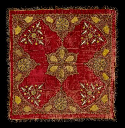 Anyag: | aranyszínű fémfonal; ezüstszínű fémfonal; selyembársony; selyemfonal |