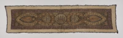 Anyag: | arany színű fémfonal; pamutvászon; színes selyemfonal |