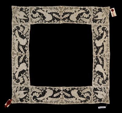 A keret formájú csipke egyforma oldalain egy-egy egymás felé forduló galambpár, köztük és a terítő sarokmintáiban dús fantáziavirágok. A galambábrázolás hasonló az ltsz. 10593-as színes szegélycsipkéhez. Formájából adódóan szél- vagy betétecsipkének is készülhetett.